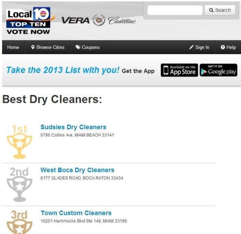 The people have spoken! Sudsies Dry Cleaners & Laundry is officially South Florida’s most beloved dry cleaner as the category winner in the 2013 WPLG Local 10 Top 10. The television station granted the company the top ranking following a dynamic voting campaign conducted through the station’s website and social media outlets. Sudsies offers a full range of clothing and specialty item services across Miami-Dade and Broward counties, including complimentary pick-up and delivery to its clientele’s location of choice.